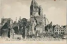 Durant la Première Guerre mondiale, le beffroi est détruit le 21 octobre 1914 par l'artillerie allemande[13], après 69 tirs d’obus[11]. Lors de la reconstruction, le beffroi est de nouveau érigé à l'identique, mais avec une structure en béton armé, pour des raisons de coût. Les plans sont dus à l'architecte en chef des monuments historiques Pierre Paquet[11]. Les travaux ont lieu en même temps que l'hôtel de ville d'Arras, qui lui est reconstruit dans le style architectural du XIVe – XVe siècle pour la façade sur la place des Héros, dans le style classique issu des travaux précédant la visite de Louis XIV pour la façade place de la Vacquerie, éliminant ainsi les transformations apportées au XIXe siècle à l'édifice[réf. souhaitée].