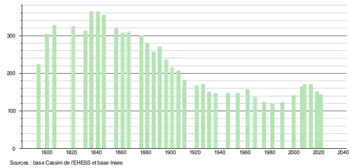 L'évolution du nombre d'habitants est connue à travers les recensements de la population effectués dans la commune depuis 1793. Pour les communes de moins de 10 000 habitants, une enquête de recensement portant sur toute la population est réalisée tous les cinq ans, les populations légales des années intermédiaires étant quant à elles estimées par interpolation ou extrapolation[33]. Pour la commune, le premier recensement exhaustif entrant dans le cadre du nouveau dispositif a été réalisé en 2008[34].