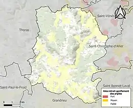 Le retrait-gonflement des sols argileux est susceptible d'engendrer des dommages importants aux bâtiments en cas d’alternance de périodes de sécheresse et de pluie. Aucune partie du territoire de la commune n'est en aléa moyen ou fort (15,8 % au niveau départemental et 48,5 % au niveau national). Sur les 431 bâtiments dénombrés sur la commune en 2019, aucun n'est en aléa moyen ou fort, à comparer aux 14 % au niveau départemental et 54 % au niveau national. Une cartographie de l'exposition du territoire national au retrait gonflement des sols argileux est disponible sur le site du BRGM[17],[Carte 1].