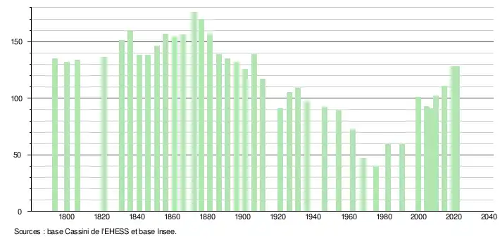 L'évolution du nombre d'habitants est connue à travers les recensements de la population effectués dans la commune depuis 1793. Pour les communes de moins de 10 000 habitants, une enquête de recensement portant sur toute la population est réalisée tous les cinq ans, les populations légales des années intermédiaires étant quant à elles estimées par interpolation ou extrapolation[30]. Pour la commune, le premier recensement exhaustif entrant dans le cadre du nouveau dispositif a été réalisé en 2004[31].
