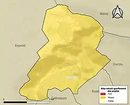 Le retrait-gonflement des sols argileux est susceptible d'engendrer des dommages importants aux bâtiments en cas d’alternance de périodes de sécheresse et de pluie. 99,6 % de la superficie communale est en aléa moyen ou fort (75,2 % au niveau départemental et 48,5 % au niveau national). Sur les 46 bâtiments dénombrés sur la commune en 2019, 46 sont en aléa moyen ou fort, soit 100 %, à comparer aux 94 % au niveau départemental et 54 % au niveau national. Une cartographie de l'exposition du territoire national au retrait gonflement des sols argileux est disponible sur le site du BRGM[25],[Carte 3].
