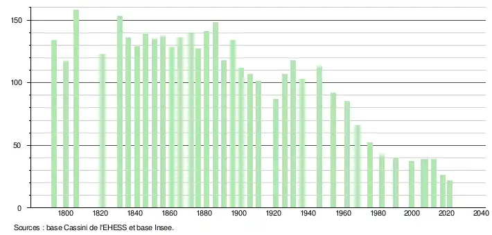 L'évolution du nombre d'habitants est connue à travers les recensements de la population effectués dans la commune depuis 1793. Pour les communes de moins de 10 000 habitants, une enquête de recensement portant sur toute la population est réalisée tous les cinq ans, les populations légales des années intermédiaires étant quant à elles estimées par interpolation ou extrapolation[28]. Pour la commune, le premier recensement exhaustif entrant dans le cadre du nouveau dispositif a été réalisé en 2007[29].