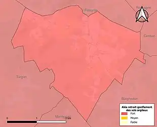 Le retrait-gonflement des sols argileux est susceptible d'engendrer des dommages importants aux bâtiments en cas d’alternance de périodes de sécheresse et de pluie. La totalité de la commune est en aléa moyen ou fort (67,4 % au niveau départemental et 48,5 % au niveau national). Sur les 109 bâtiments dénombrés sur la commune en 2019, 109 sont en aléa moyen ou fort, soit 100 %, à comparer aux 84 % au niveau départemental et 54 % au niveau national. Une cartographie de l'exposition du territoire national au retrait gonflement des sols argileux est disponible sur le site du BRGM[19],[Carte 2].