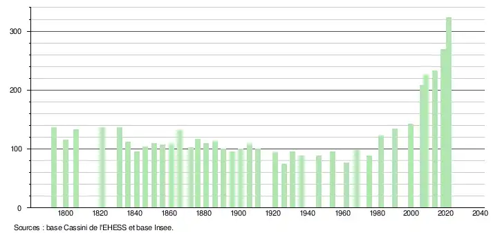 L'évolution du nombre d'habitants est connue à travers les recensements de la population effectués dans la commune depuis 1793. Pour les communes de moins de 10 000 habitants, une enquête de recensement portant sur toute la population est réalisée tous les cinq ans, les populations légales des années intermédiaires étant quant à elles estimées par interpolation ou extrapolation[23]. Pour la commune, le premier recensement exhaustif entrant dans le cadre du nouveau dispositif a été réalisé en 2008[24].