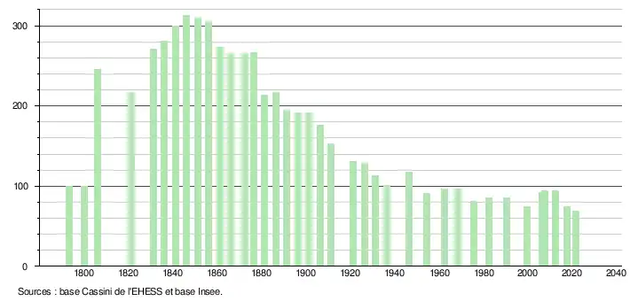 L'évolution du nombre d'habitants est connue à travers les recensements de la population effectués dans la commune depuis 1793. Pour les communes de moins de 10 000 habitants, une enquête de recensement portant sur toute la population est réalisée tous les cinq ans, les populations légales des années intermédiaires étant quant à elles estimées par interpolation ou extrapolation[20]. Pour la commune, le premier recensement exhaustif entrant dans le cadre du nouveau dispositif a été réalisé en 2007[21].