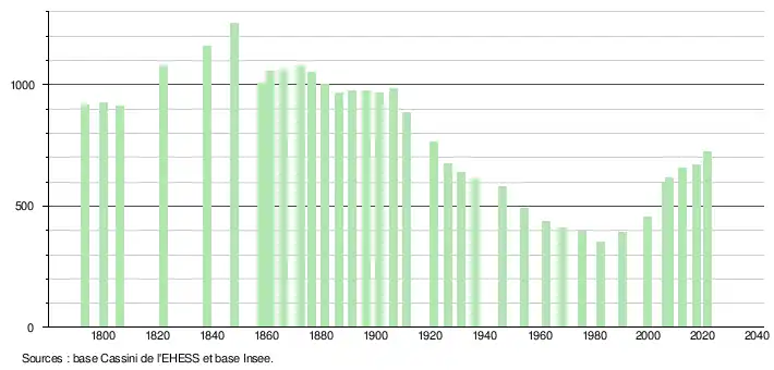 L'évolution du nombre d'habitants est connue à travers les recensements de la population effectués dans la commune depuis 1793. Pour les communes de moins de 10 000 habitants, une enquête de recensement portant sur toute la population est réalisée tous les cinq ans, les populations légales des années intermédiaires étant quant à elles estimées par interpolation ou extrapolation[21]. Pour la commune, le premier recensement exhaustif entrant dans le cadre du nouveau dispositif a été réalisé en 2007[22].