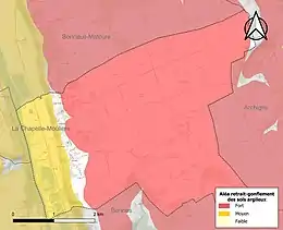Les mouvements de terrains susceptibles de se produire sur la commune sont des affaissements et effondrements liés aux cavités souterraines (hors mines) et des tassements différentiels[19]. Afin de mieux appréhender le risque d’affaissement de terrain, un inventaire national permet de localiser les éventuelles cavités souterraines sur la commune[20]. Le retrait-gonflement des sols argileux est susceptible d'engendrer des dommages importants aux bâtiments en cas d’alternance de périodes de sécheresse et de pluie[21]. 95,5 % de la superficie communale est en aléa moyen ou fort (79,5 % au niveau départemental et 48,5 % au niveau national)[Carte 2]. Depuis le , en application de la loi ÉLAN, différentes contraintes s'imposent aux vendeurs, maîtres d'ouvrages ou constructeurs de biens situés dans une zone classée en aléa moyen ou fort[Note 7],[22].