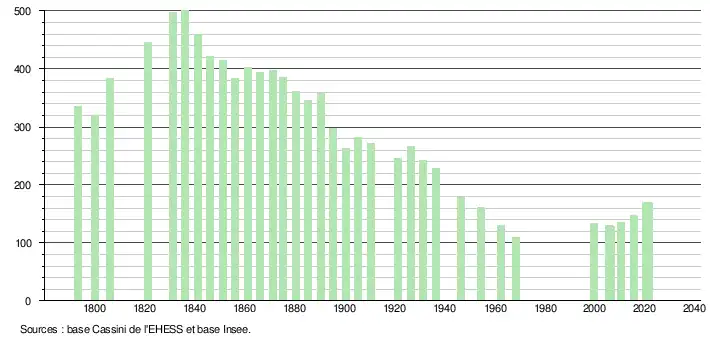 L'évolution du nombre d'habitants est connue à travers les recensements de la population effectués dans la commune depuis 1793. Pour les communes de moins de 10 000 habitants, une enquête de recensement portant sur toute la population est réalisée tous les cinq ans, les populations légales des années intermédiaires étant quant à elles estimées par interpolation ou extrapolation[20]. Pour la commune, le premier recensement exhaustif entrant dans le cadre du nouveau dispositif a été réalisé en 2005[21].