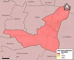Le retrait-gonflement des sols argileux est susceptible d'engendrer des dommages importants aux bâtiments en cas d’alternance de périodes de sécheresse et de pluie. La totalité de la commune est en aléa moyen ou fort (88,8 % au niveau départemental et 48,5 % au niveau national). Sur les 87 bâtiments dénombrés sur la commune en 2019, 87 sont en aléa moyen ou fort, soit 100 %, à comparer aux 98 % au niveau départemental et 54 % au niveau national. Une cartographie de l'exposition du territoire national au retrait gonflement des sols argileux est disponible sur le site du BRGM[23],[Carte 1].