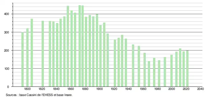 L'évolution du nombre d'habitants est connue à travers les recensements de la population effectués dans la commune depuis 1793. Pour les communes de moins de 10 000 habitants, une enquête de recensement portant sur toute la population est réalisée tous les cinq ans, les populations légales des années intermédiaires étant quant à elles estimées par interpolation ou extrapolation[27]. Pour la commune, le premier recensement exhaustif entrant dans le cadre du nouveau dispositif a été réalisé en 2006[28].