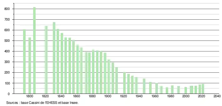 L'évolution du nombre d'habitants est connue à travers les recensements de la population effectués dans la commune depuis 1793. Pour les communes de moins de 10 000 habitants, une enquête de recensement portant sur toute la population est réalisée tous les cinq ans, les populations légales des années intermédiaires étant quant à elles estimées par interpolation ou extrapolation[17]. Pour la commune, le premier recensement exhaustif entrant dans le cadre du nouveau dispositif a été réalisé en 2007[18].