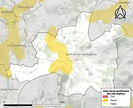 Le retrait-gonflement des sols argileux est susceptible d'engendrer des dommages importants aux bâtiments en cas d’alternance de périodes de sécheresse et de pluie. 12,9 % de la superficie communale est en aléa moyen ou fort (33,6 % au niveau départemental et 48,5 % au niveau national). Sur les 267 bâtiments dénombrés sur la commune en 2019, 19 sont en aléa moyen ou fort, soit 7 %, à comparer aux 25 % au niveau départemental et 54 % au niveau national. Une cartographie de l'exposition du territoire national au retrait gonflement des sols argileux est disponible sur le site du BRGM[17],[Carte 2].