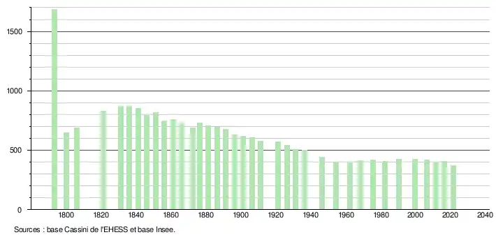 L'évolution du nombre d'habitants est connue à travers les recensements de la population effectués dans la commune depuis 1793. Pour les communes de moins de 10 000 habitants, une enquête de recensement portant sur toute la population est réalisée tous les cinq ans, les populations légales des années intermédiaires étant quant à elles estimées par interpolation ou extrapolation[23]. Pour la commune, le premier recensement exhaustif entrant dans le cadre du nouveau dispositif a été réalisé en 2006[24].
