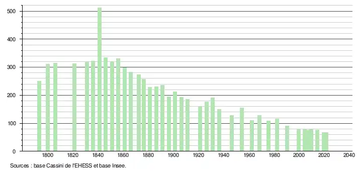 L'évolution du nombre d'habitants est connue à travers les recensements de la population effectués dans la commune depuis 1793. Pour les communes de moins de 10 000 habitants, une enquête de recensement portant sur toute la population est réalisée tous les cinq ans, les populations légales des années intermédiaires étant quant à elles estimées par interpolation ou extrapolation[17]. Pour la commune, le premier recensement exhaustif entrant dans le cadre du nouveau dispositif a été réalisé en 2004[18].