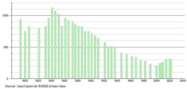 L'évolution du nombre d'habitants est connue à travers les recensements de la population effectués dans la commune depuis 1793. Pour les communes de moins de 10 000 habitants, une enquête de recensement portant sur toute la population est réalisée tous les cinq ans, les populations légales des années intermédiaires étant quant à elles estimées par interpolation ou extrapolation[16]. Pour la commune, le premier recensement exhaustif entrant dans le cadre du nouveau dispositif a été réalisé en 2004[17].