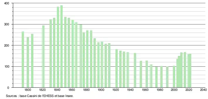 | L'évolution du nombre d'habitants est connue à travers les recensements de la population effectués dans la commune depuis 1793. Pour les communes de moins de 10 000 habitants, une enquête de recensement portant sur toute la population est réalisée tous les cinq ans, les populations légales des années intermédiaires étant quant à elles estimées par interpolation ou extrapolation[27]. Pour la commune, le premier recensement exhaustif entrant dans le cadre du nouveau dispositif a été réalisé en 2004[28]. En 2021, la commune comptait 161 habitants[Note 6], en diminution de 3,59 % par rapport à 2015 (Tarn : +1,82 %, France hors Mayotte : +1,84 %). |