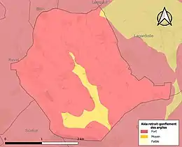 La commune est vulnérable au risque de mouvements de terrains constitué principalement du retrait-gonflement des sols argileux[22]. Cet aléa est susceptible d'engendrer des dommages importants aux bâtiments en cas d’alternance de périodes de sécheresse et de pluie. La totalité de la commune est en aléa moyen ou fort (76,3 % au niveau départemental et 48,5 % au niveau national). Sur les 85 bâtiments dénombrés sur la commune en 2019, 85 sont en aléa moyen ou fort, soit 100 %, à comparer aux 90 % au niveau départemental et 54 % au niveau national. Une cartographie de l'exposition du territoire national au retrait gonflement des sols argileux est disponible sur le site du BRGM[23],[Carte 3].