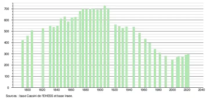 L'évolution du nombre d'habitants est connue à travers les recensements de la population effectués dans la commune depuis 1793. Pour les communes de moins de 10 000 habitants, une enquête de recensement portant sur toute la population est réalisée tous les cinq ans, les populations légales des années intermédiaires étant quant à elles estimées par interpolation ou extrapolation[23]. Pour la commune, le premier recensement exhaustif entrant dans le cadre du nouveau dispositif a été réalisé en 2008[24].