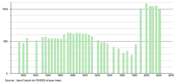 L'évolution du nombre d'habitants est connue à travers les recensements de la population effectués dans la commune depuis 1793. Pour les communes de moins de 10 000 habitants, une enquête de recensement portant sur toute la population est réalisée tous les cinq ans, les populations légales des années intermédiaires étant quant à elles estimées par interpolation ou extrapolation[26]. Pour la commune, le premier recensement exhaustif entrant dans le cadre du nouveau dispositif a été réalisé en 2005[27].