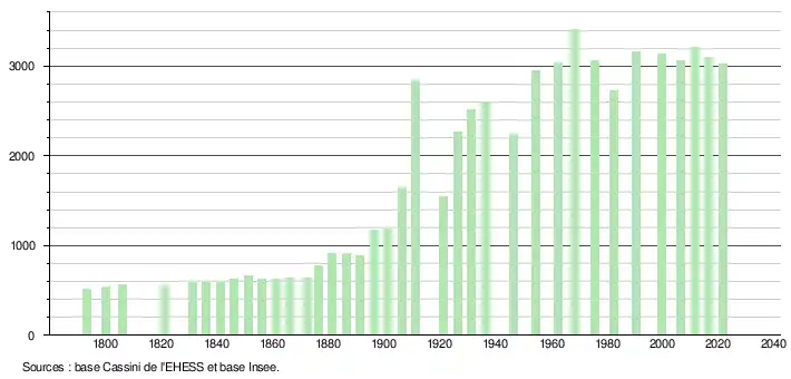 L'évolution du nombre d'habitants est connue à travers les recensements de la population effectués dans la commune depuis 1793. Pour les communes de moins de 10 000 habitants, une enquête de recensement portant sur toute la population est réalisée tous les cinq ans, les populations légales des années intermédiaires étant quant à elles estimées par interpolation ou extrapolation[19]. Pour la commune, le premier recensement exhaustif entrant dans le cadre du nouveau dispositif a été réalisé en 2006[20].