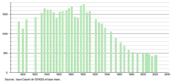 L'évolution du nombre d'habitants est connue à travers les recensements de la population effectués dans la commune depuis 1793. Pour les communes de moins de 10 000 habitants, une enquête de recensement portant sur toute la population est réalisée tous les cinq ans, les populations légales des années intermédiaires étant quant à elles estimées par interpolation ou extrapolation[24]. Pour la commune, le premier recensement exhaustif entrant dans le cadre du nouveau dispositif a été réalisé en 2004[25].