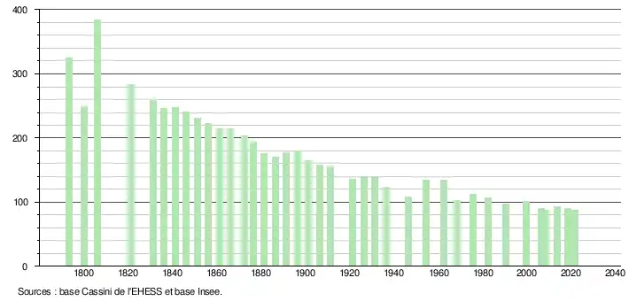 L'évolution du nombre d'habitants est connue à travers les recensements de la population effectués dans la commune depuis 1793. Pour les communes de moins de 10 000 habitants, une enquête de recensement portant sur toute la population est réalisée tous les cinq ans, les populations légales des années intermédiaires étant quant à elles estimées par interpolation ou extrapolation[24]. Pour la commune, le premier recensement exhaustif entrant dans le cadre du nouveau dispositif a été réalisé en 2008[25].