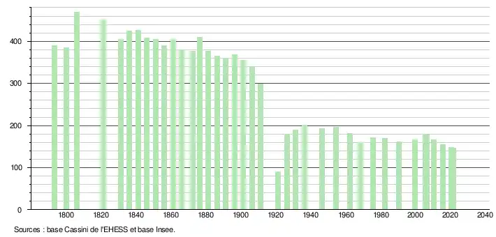 L'évolution du nombre d'habitants est connue à travers les recensements de la population effectués dans la commune depuis 1793. Pour les communes de moins de 10 000 habitants, une enquête de recensement portant sur toute la population est réalisée tous les cinq ans, les populations légales des années intermédiaires étant quant à elles estimées par interpolation ou extrapolation[40]. Pour la commune, le premier recensement exhaustif entrant dans le cadre du nouveau dispositif a été réalisé en 2005[41].