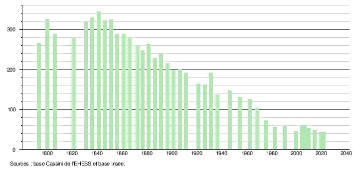 L'évolution du nombre d'habitants est connue à travers les recensements de la population effectués dans la commune depuis 1793. Pour les communes de moins de 10 000 habitants, une enquête de recensement portant sur toute la population est réalisée tous les cinq ans, les populations légales des années intermédiaires étant quant à elles estimées par interpolation ou extrapolation[28]. Pour la commune, le premier recensement exhaustif entrant dans le cadre du nouveau dispositif a été réalisé en 2004[29].