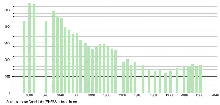 L'évolution du nombre d'habitants est connue à travers les recensements de la population effectués dans la commune depuis 1793. Pour les communes de moins de 10 000 habitants, une enquête de recensement portant sur toute la population est réalisée tous les cinq ans, les populations légales des années intermédiaires étant quant à elles estimées par interpolation ou extrapolation[23]. Pour la commune, le premier recensement exhaustif entrant dans le cadre du nouveau dispositif a été réalisé en 2005[24].