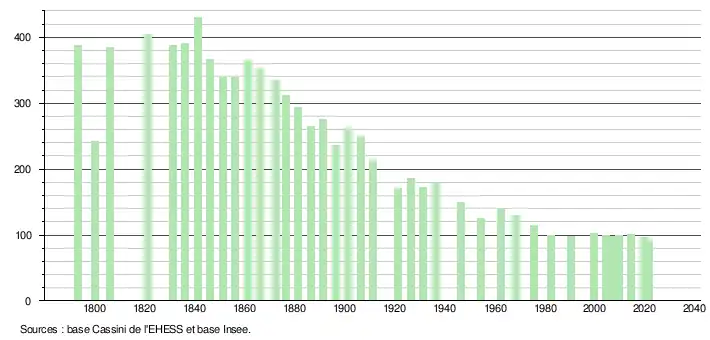 L'évolution du nombre d'habitants est connue à travers les recensements de la population effectués dans la commune depuis 1793. Pour les communes de moins de 10 000 habitants, une enquête de recensement portant sur toute la population est réalisée tous les cinq ans, les populations légales des années intermédiaires étant quant à elles estimées par interpolation ou extrapolation[17]. Pour la commune, le premier recensement exhaustif entrant dans le cadre du nouveau dispositif a été réalisé en 2004[18].