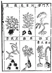Dans Bencao gangmu, la classification détaillée de toutes substances naturelles utilisées en thérapie est organisée en 16 sections (bu)[14], 60 catégories (lei), et environ 1 895 notices (zhong)[1].