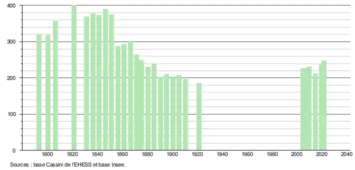 L'évolution du nombre d'habitants est connue à travers les recensements de la population effectués dans la commune depuis 1793. Pour les communes de moins de 10 000 habitants, une enquête de recensement portant sur toute la population est réalisée tous les cinq ans, les populations légales des années intermédiaires étant quant à elles estimées par interpolation ou extrapolation[16]. Pour la commune, le premier recensement exhaustif entrant dans le cadre du nouveau dispositif a été réalisé en 2004[17].