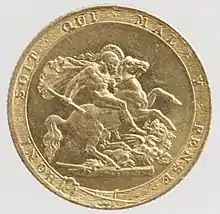 Après la mort de George III en 1820, Benedetto Pistrucci travailla le buste de monnaie du nouveau roi, George IV, en préparatif des futures pièces de monnaie. Mais le roi méprisait l'œuvre de l'italien lui reprochant notamment son visage gonflée[19] — selon Clancy, « ses caractéristiques complètes impliquant quelque chose des appétits du monarque ». [20] Le roi et Pistrucci entrèrent également en conflit sur la médaille du couronnement, le roi s'opposant au fait d'être placé au même niveau que les représentations allégoriques de ses royaumes. Pour résoudre ce conflit, Pistrucci déclara: "J'élèverai Sa Majesté" ce qui fut fait. Le toupet du roi a également provoqué des difficultés dans le processus de gravure[21]. Sur le monnayage, la représentation du souverain fut modifiée en enlevant sa jarretière et la lance cassée du saint fut remplacée par une épée. Ainsi, il est devenu très semblable au dessin actuellement utilisé sur les Souverains modernes[22] mais avec l'absence d'une bannière sur le casque de Saint George. Cette version du revers a été frappée de 1821 à 1825[note 1], mais le dessin de Pistrucci sera par la suite absent du souverain de 1825 à 1874, après sa mort[23].