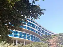 Résidence Prefeito Mendes de Moraes, dit le Pedregulho (en), en 2016, après rénovation. Tous les logements de cet ensemble construit dans les années 1950 par Affonso Eduardo Reidy ont vue sur la baie de Guanabara.
