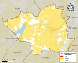 La commune est vulnérable au risque de mouvements de terrains constitué principalement du retrait-gonflement des sols argileux[15]. Cet aléa est susceptible d'engendrer des dommages importants aux bâtiments en cas d’alternance de périodes de sécheresse et de pluie. 77 % de la superficie communale est en aléa moyen ou fort (90 % au niveau départemental et 48,5 % au niveau national). Sur les 342 bâtiments dénombrés sur la commune en 2019, 297 sont en aléa moyen ou fort, soit 87 %, à comparer aux 83 % au niveau départemental et 54 % au niveau national. Une cartographie de l'exposition du territoire national au retrait gonflement des sols argileux est disponible sur le site du BRGM[16],[Carte 2].