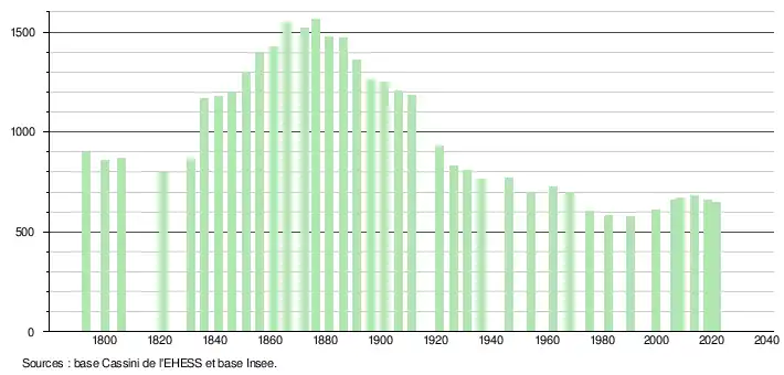 L'évolution du nombre d'habitants est connue à travers les recensements de la population effectués dans la commune depuis 1793. Pour les communes de moins de 10 000 habitants, une enquête de recensement portant sur toute la population est réalisée tous les cinq ans, les populations légales des années intermédiaires étant quant à elles estimées par interpolation ou extrapolation[20]. Pour la commune, le premier recensement exhaustif entrant dans le cadre du nouveau dispositif a été réalisé en 2008[21].
