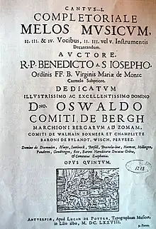 - Opus I Missae, litaniae, et motetta, IV. V. VI. vocibus cum instrument. et ripienis, Phalèses Erben, Anvers 1666 (deux messes, trois motets et deux litanies pour 5–6 voix solistes, chœur à quatre voix, instruments et basse continue)