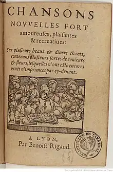 - Chansons nouvelles fort amoureuses, plaisantes & recreatives [Texte imprimé]: sur plusieurs beaux & divers chants, contenans plusieurs sortes de couleurs & fleurs, lesquelles n'ont esté encores veuës n'imprimees par cy-devant. A Lyon, par Benoist Rigaud (XVIe siècle).