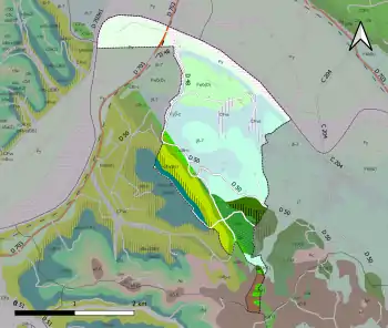 L'occupation des sols de la commune, telle qu'elle ressort de la base de données européenne d’occupation biophysique des sols Corine Land Cover (CLC), est marquée par l'importance des territoires agricoles (49,5 % en 2018), une proportion sensiblement équivalente à celle de 1990 (48,5 %). La répartition détaillée en 2018 est la suivante : forêts (44,1 %), zones agricoles hétérogènes (34,1 %), terres arables (13,4 %), eaux continentales[Note 4] (6,3 %), prairies (2 %)[38]. L'évolution de l’occupation des sols de la commune et de ses infrastructures peut être observée sur les différentes représentations cartographiques du territoire : la carte de Cassini (XVIIIe siècle), la carte d'état-major (1820-1866) et les cartes ou photos aériennes de l'IGN pour la période actuelle (1950 à aujourd'hui)[Carte 3].