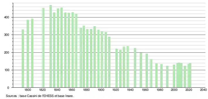 L'évolution du nombre d'habitants est connue à travers les recensements de la population effectués dans la commune depuis 1793. Pour les communes de moins de 10 000 habitants, une enquête de recensement portant sur toute la population est réalisée tous les cinq ans, les populations légales des années intermédiaires étant quant à elles estimées par interpolation ou extrapolation[12]. Pour la commune, le premier recensement exhaustif entrant dans le cadre du nouveau dispositif a été réalisé en 2004[13].
