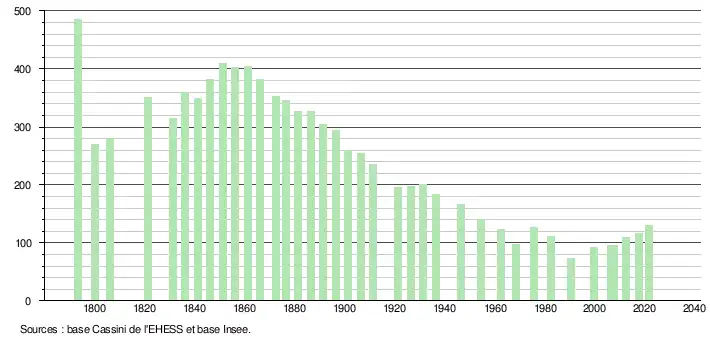 L'évolution du nombre d'habitants est connue à travers les recensements de la population effectués dans la commune depuis 1793. Pour les communes de moins de 10 000 habitants, une enquête de recensement portant sur toute la population est réalisée tous les cinq ans, les populations légales des années intermédiaires étant quant à elles estimées par interpolation ou extrapolation[28]. Pour la commune, le premier recensement exhaustif entrant dans le cadre du nouveau dispositif a été réalisé en 2007[29].