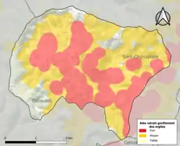 Le retrait-gonflement des sols argileux est susceptible d'engendrer des dommages importants aux bâtiments en cas d’alternance de périodes de sécheresse et de pluie. 82,3 % de la superficie communale est en aléa moyen ou fort (67,7 % au niveau départemental et 48,5 % au niveau national). Sur les 97 bâtiments dénombrés sur la commune en 2019, 70 sont en aléa moyen ou fort, soit 72 %, à comparer aux 72 % au niveau départemental et 54 % au niveau national. Une cartographie de l'exposition du territoire national au retrait gonflement des sols argileux est disponible sur le site du BRGM[25],[Carte 2].