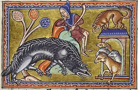 Enluminure représentant (métaphore) le berger qui dort en pensant ses moutons protégés du loup par la bergerie
