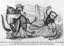Caricature politique de 1861: "La neutralité du gouverneur Magoffin signifie tenir le coq (Oncle Sam) pendant que le chat confédéré (Jeff Davis) tue ses poulets."