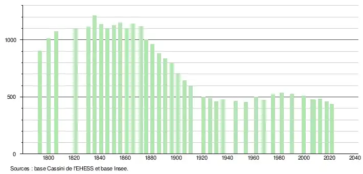 L'évolution du nombre d'habitants est connue à travers les recensements de la population effectués dans la commune depuis 1793. Pour les communes de moins de 10 000 habitants, une enquête de recensement portant sur toute la population est réalisée tous les cinq ans, les populations légales des années intermédiaires étant quant à elles estimées par interpolation ou extrapolation[19]. Pour la commune, le premier recensement exhaustif entrant dans le cadre du nouveau dispositif a été réalisé en 2007[20].