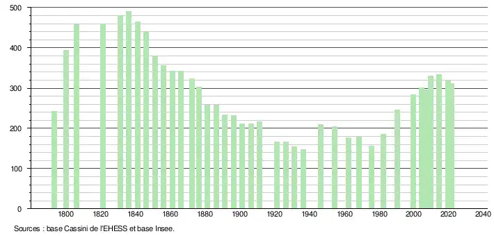 L'évolution du nombre d'habitants est connue à travers les recensements de la population effectués dans la commune depuis 1793. Pour les communes de moins de 10 000 habitants, une enquête de recensement portant sur toute la population est réalisée tous les cinq ans, les populations légales des années intermédiaires étant quant à elles estimées par interpolation ou extrapolation[28]. Pour la commune, le premier recensement exhaustif entrant dans le cadre du nouveau dispositif a été réalisé en 2004[29].