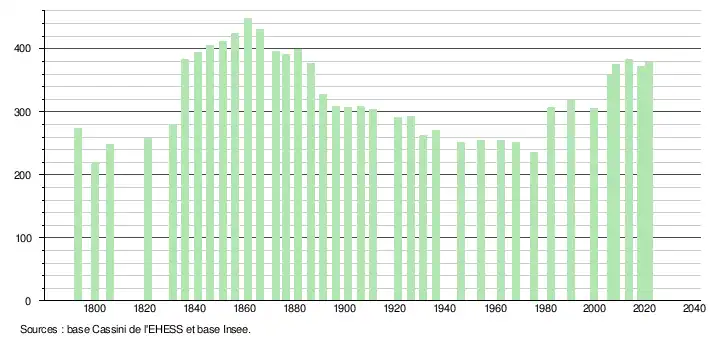 L'évolution du nombre d'habitants est connue à travers les recensements de la population effectués dans la commune depuis 1793. Pour les communes de moins de 10 000 habitants, une enquête de recensement portant sur toute la population est réalisée tous les cinq ans, les populations légales des années intermédiaires étant quant à elles estimées par interpolation ou extrapolation[28]. Pour la commune, le premier recensement exhaustif entrant dans le cadre du nouveau dispositif a été réalisé en 2008[29].