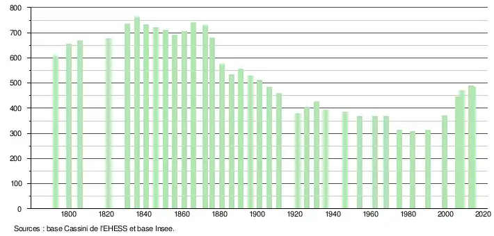 L'évolution du nombre d'habitants est connue à travers les recensements de la population effectués dans la commune depuis 1793. Pour les communes de moins de 10 000 habitants, une enquête de recensement portant sur toute la population est réalisée tous les cinq ans, les populations légales des années intermédiaires étant quant à elles estimées par interpolation ou extrapolation[3]. Pour la commune, le premier recensement exhaustif entrant dans le cadre du nouveau dispositif a été réalisé en 2008[4].