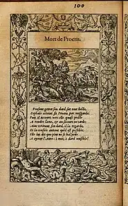 L’édition de 1557 publiée par Jean I Tournes est illustrée de 178 gravures par Bernard Salomon[6]. Ces gravures accompagnent le texte d’Ovide. Le format est emblématique de la collaboration entre Tournes et Salomon qui existe depuis leur association au milieu des années 1540, c’est-à-dire que les pages se construisent autour d’un titre, d’une gravure avec huitain et d’une bordure soignée.