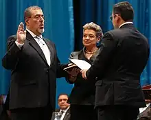 Le , le nouveau Congrès, issu des élections législatives du , doit tenir sa propre séance d'installation, mais une partie des députés sortants retardent intentionnellement celle-ci et par ricochet l'investiture du nouveau président qui devait commencer à 15 h[23]. Ces évènements ont pour effet de provoquer des manifestations de ses partisans aux abords du siège du Congrès à Guatemala[24]. Enfin, après une journée mouvementée, la séance d'investiture peut commencer peu avant minuit puis Bernardo Arévalo et Karin Herrera prêtent serment respectivement comme président et vice-présidente du Guatemala devant Samuel Pérez Álvarez, président du Congrès, dans le théâtre national Miguel Ángel Asturias le peu après minuit[25],[26].
